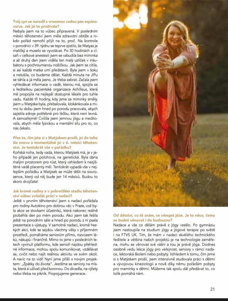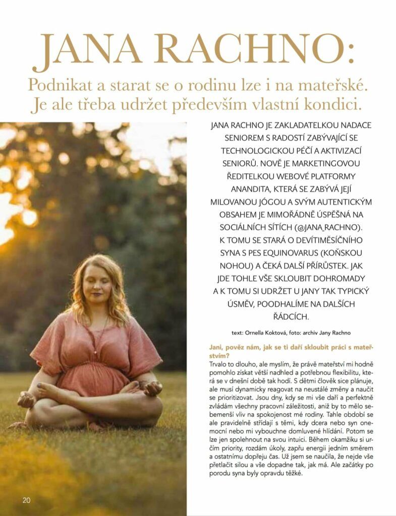 Energetická, krásná a velmi talentovaná žena – to je Jana Rachno. Žena, která je zakladatelkou nadace Seniorem s radostí, marketingovou ředitelkou webové platformy ANANDITA a také je to především matka syna s vrozenou vadou Pes equinovarus. Pod srdcem nosí další štěstí. A jak to všechno zvládá? Pojďme si o tom přečíst.